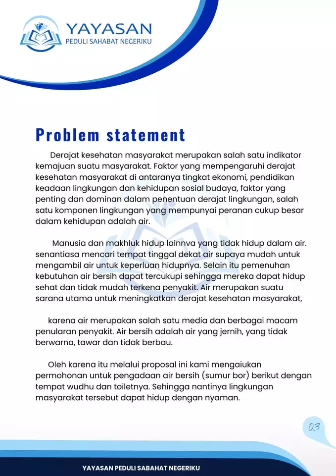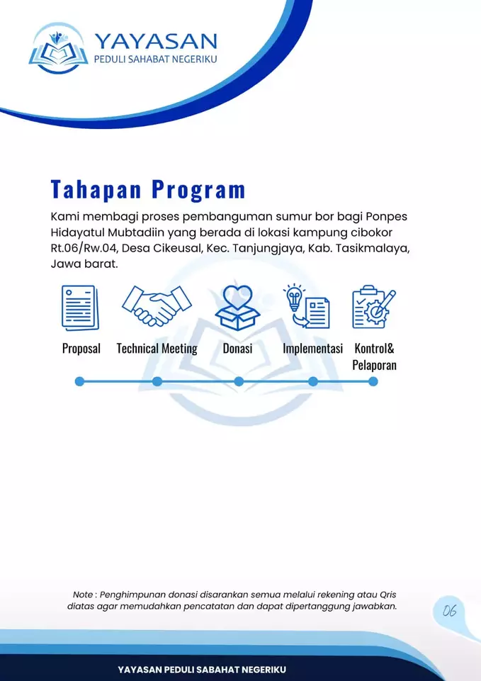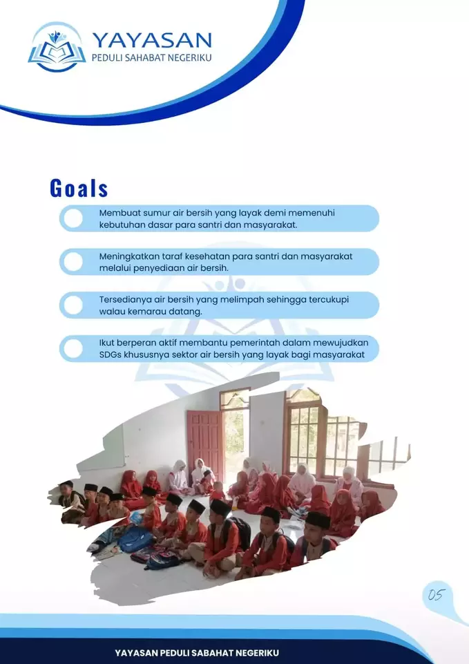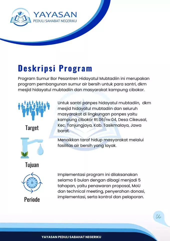 Program ini bertujuan untuk membangun sumur bor bagi pesantren, masjid, DTA/MDTA, dan masyarakat. Penyesuaian dilakukan sehingga biaya 1 paket sumur bor menjadi Rp 35.000.000 (sebelumnya Rp 50.000.000). Mulai Februari, program ini hanya mencakup pembangunan sumur bor beserta fasilitas utamanya, seperti toren air, tanpa mencakup fasilitas tambahan seperti tempat wudhu, toilet, atau perbaikan lainnya yang bersifat kondisional.